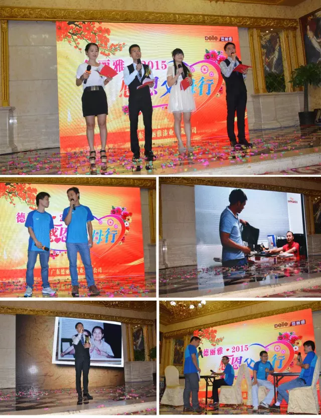 接下來的節目中,由德麗雅人自編自導自演的微電影《德麗雅人》實在感人,播放到員工給父母打電話的真實場景,她們在說出“我愛你”那三個字時的動人場景使觀者潸然淚下;廣東銷售部張濤的精彩演講《我的姨奶》更是感動人心;《員工對父母·語》視頻對父母“我愛你”的表達,我想大部分父母都是頭一次聽到孩子用這種方式表達對自己的愛。聽完孩子們的心聲后,重慶銷售部劉永豪的父親,劉爸爸上臺給予孩子們送上祝福,劉永豪給父親送上鮮花并深情擁抱。晚會還有一個重要的環節是表彰為公司服務五年和十年的榮譽員工,他們是我們企業的中流砥柱。而我發現在給這些優秀員工表彰時,我們父母的眼神里滿滿的都是幸福!