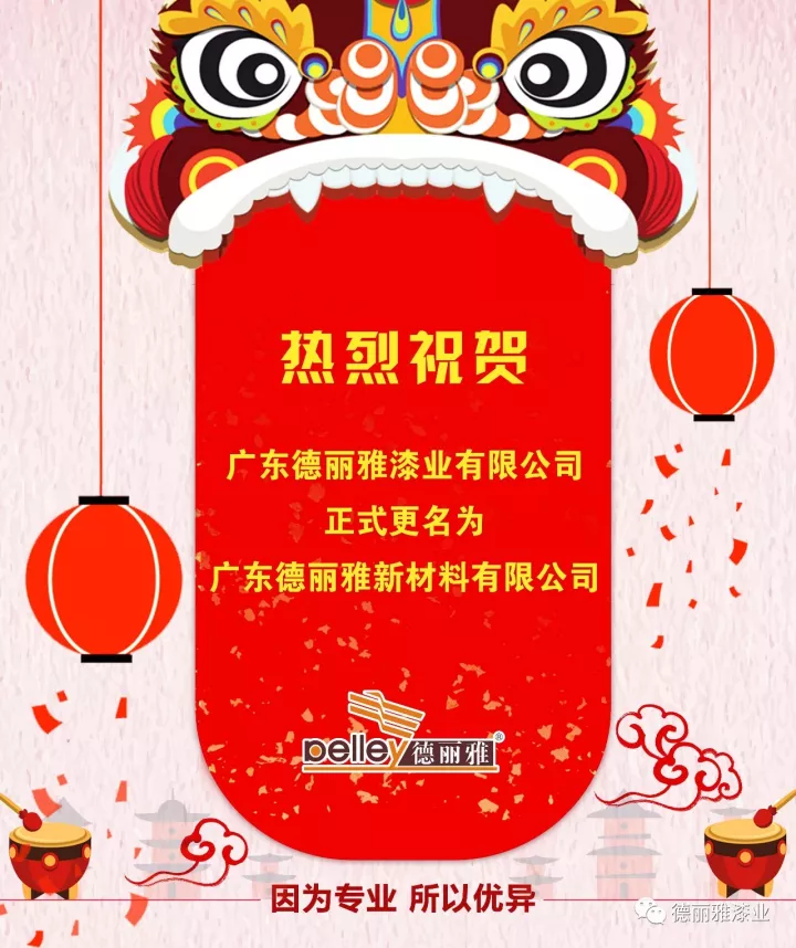 隨著公司的發展與壯大,為更好的體現公司研發生產高新涂料的性質,展現德麗雅的核心競爭力,廣東德麗雅漆業有限公司已正式更名為: